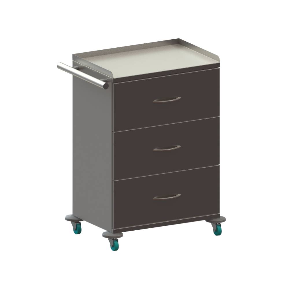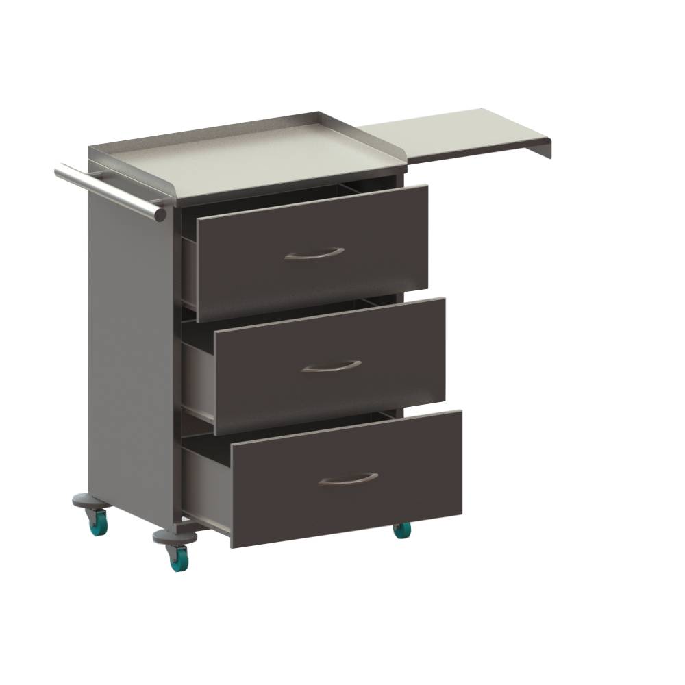 С 3 выдвижными ящиками. Столешница с бортиком. Сбоку ручка для перемещения. С др. стороны выдвижная полка. Колёса d 75 мм., два колеса с тормозом.