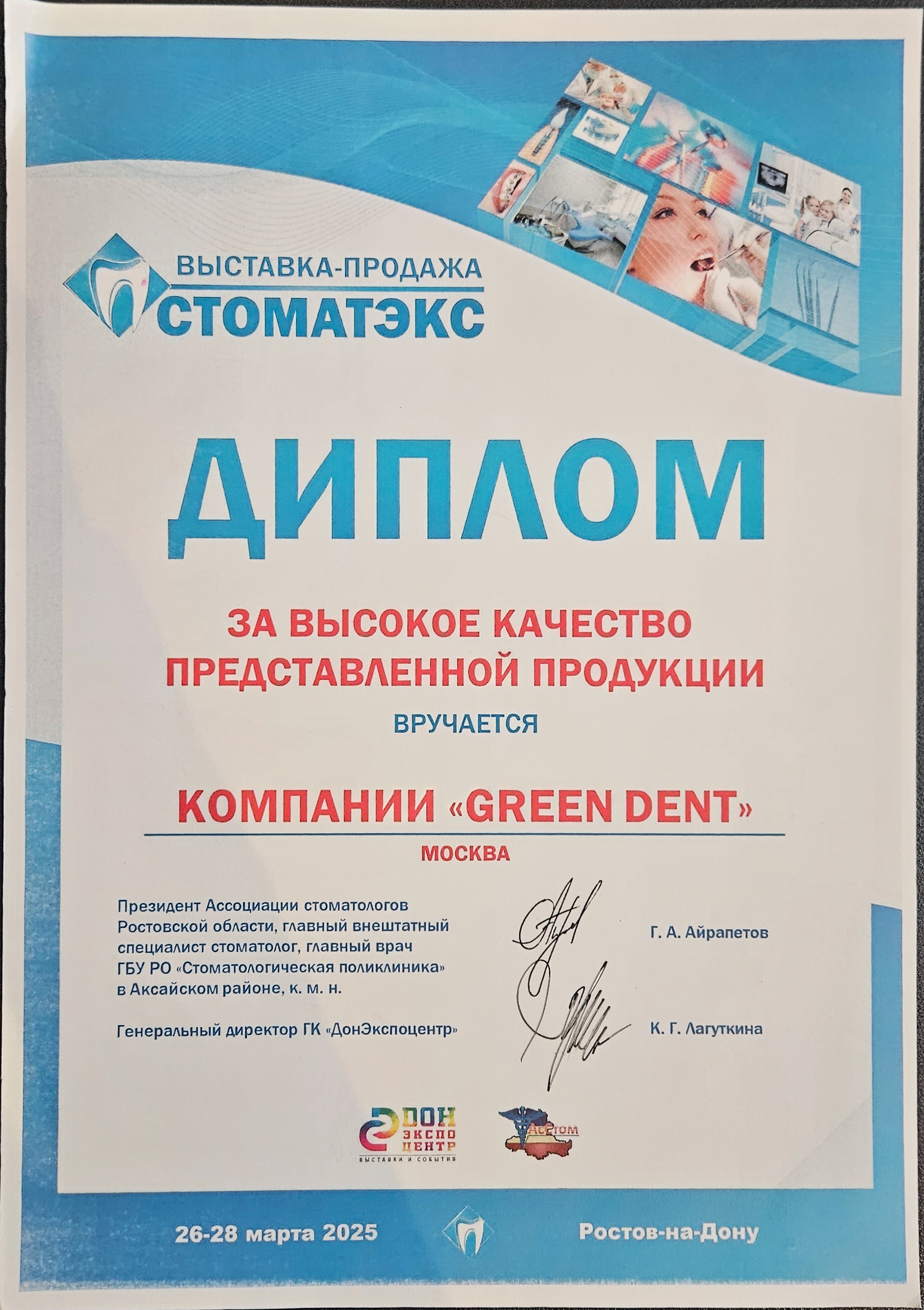 Диплом GREEN DENT за высокое качество и новизну продукции