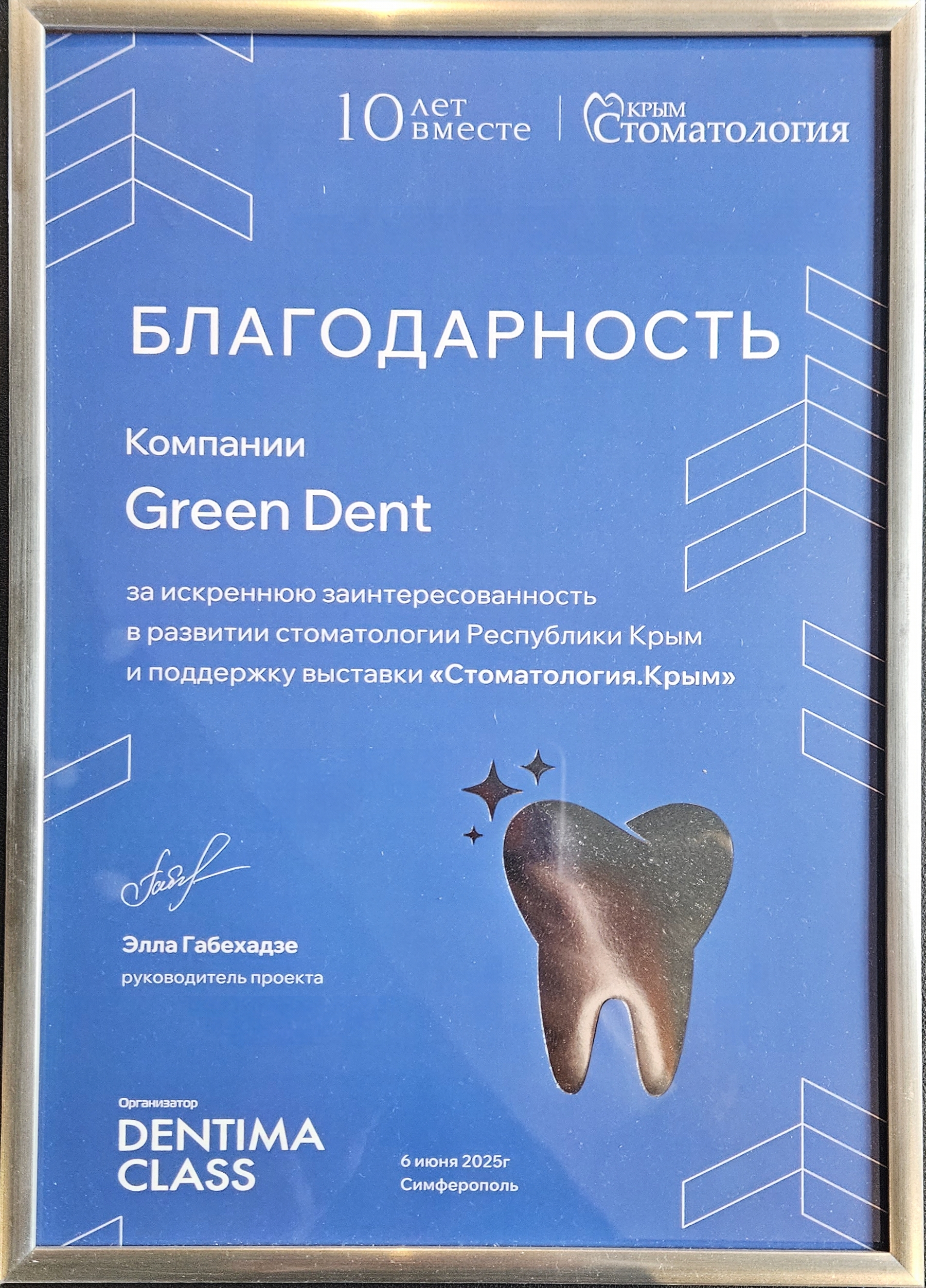 Благодарность за поддержку «Стоматология. Крым»