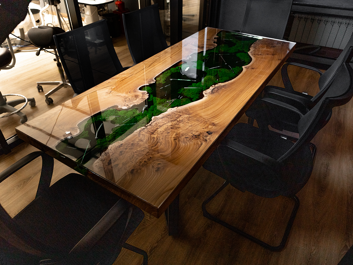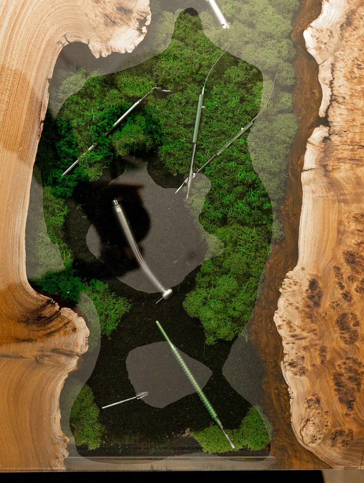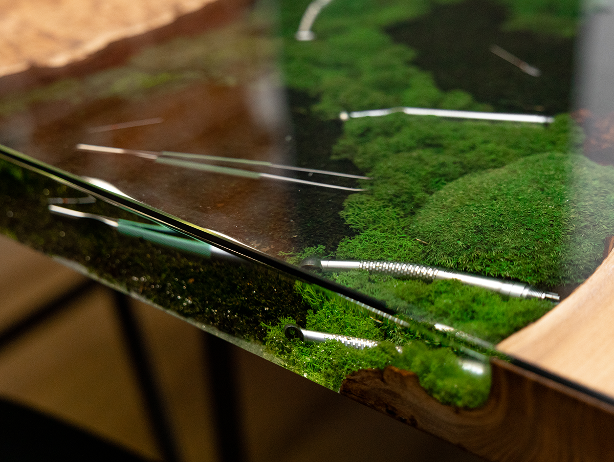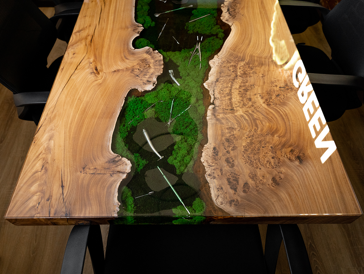 В основе стола – эксклюзивный слэб из горного карагача размером 2000×800 мм. Красивая структура дерева и необычная яркая фактура среза окружают реку из эпоксидной смолы, внутри которой спрятаны стоматологические инструменты и стабилизированный мох. А в центре ослепительным блеском переливается металлическая буква G.