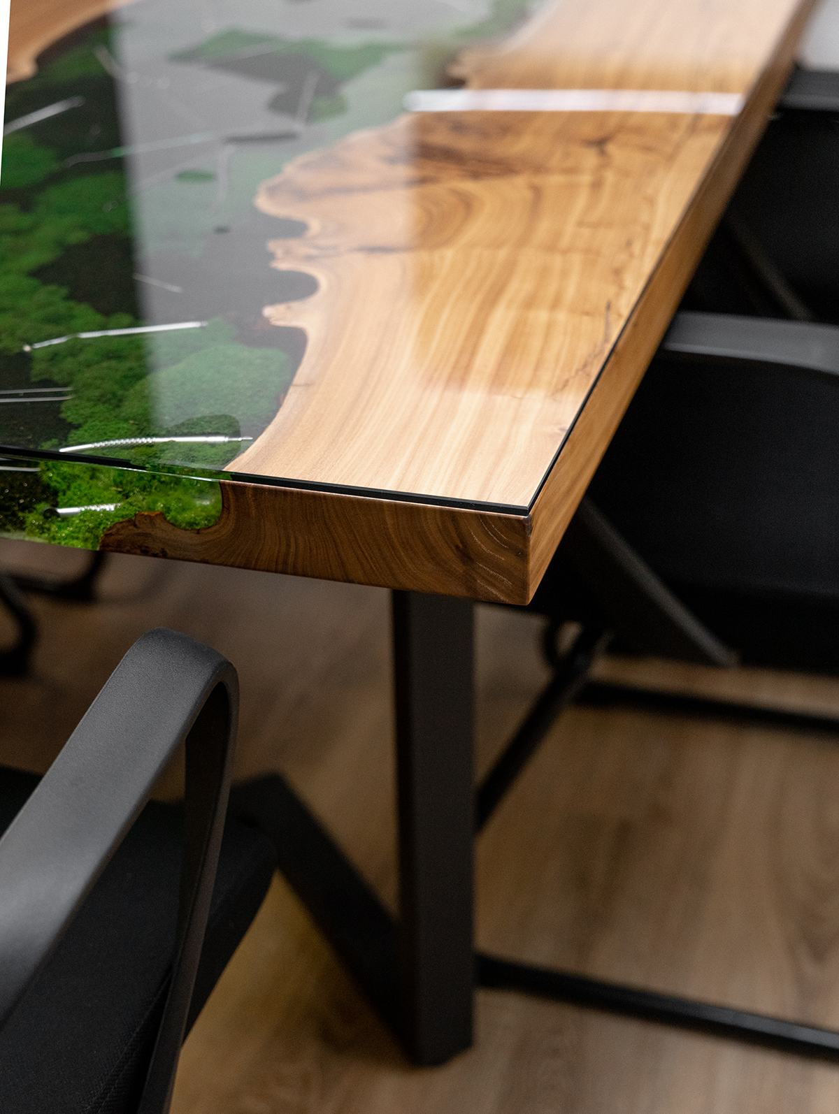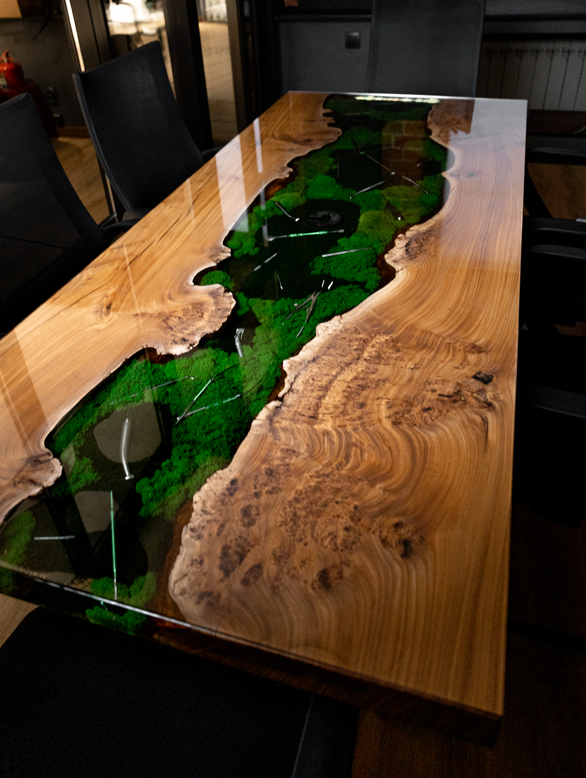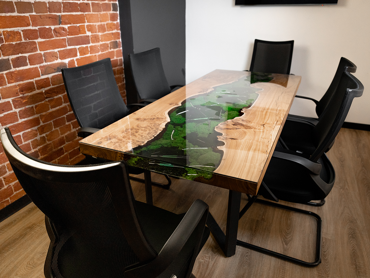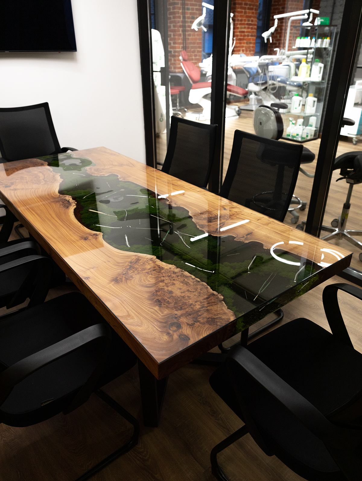 В основе стола – эксклюзивный слэб из горного карагача размером 2000×800 мм. Красивая структура дерева и необычная яркая фактура среза окружают реку из эпоксидной смолы, внутри которой спрятаны стоматологические инструменты и стабилизированный мох. А в центре ослепительным блеском переливается металлическая буква G.