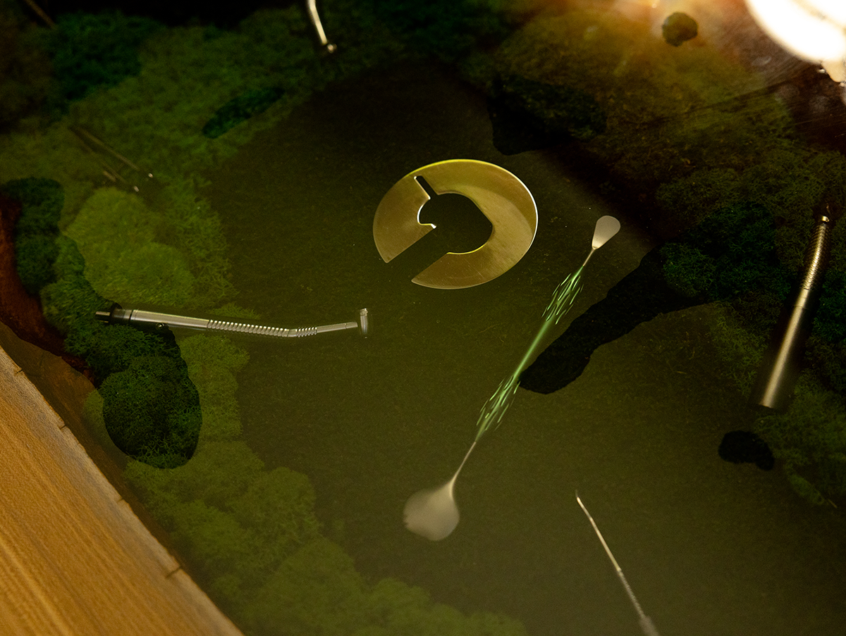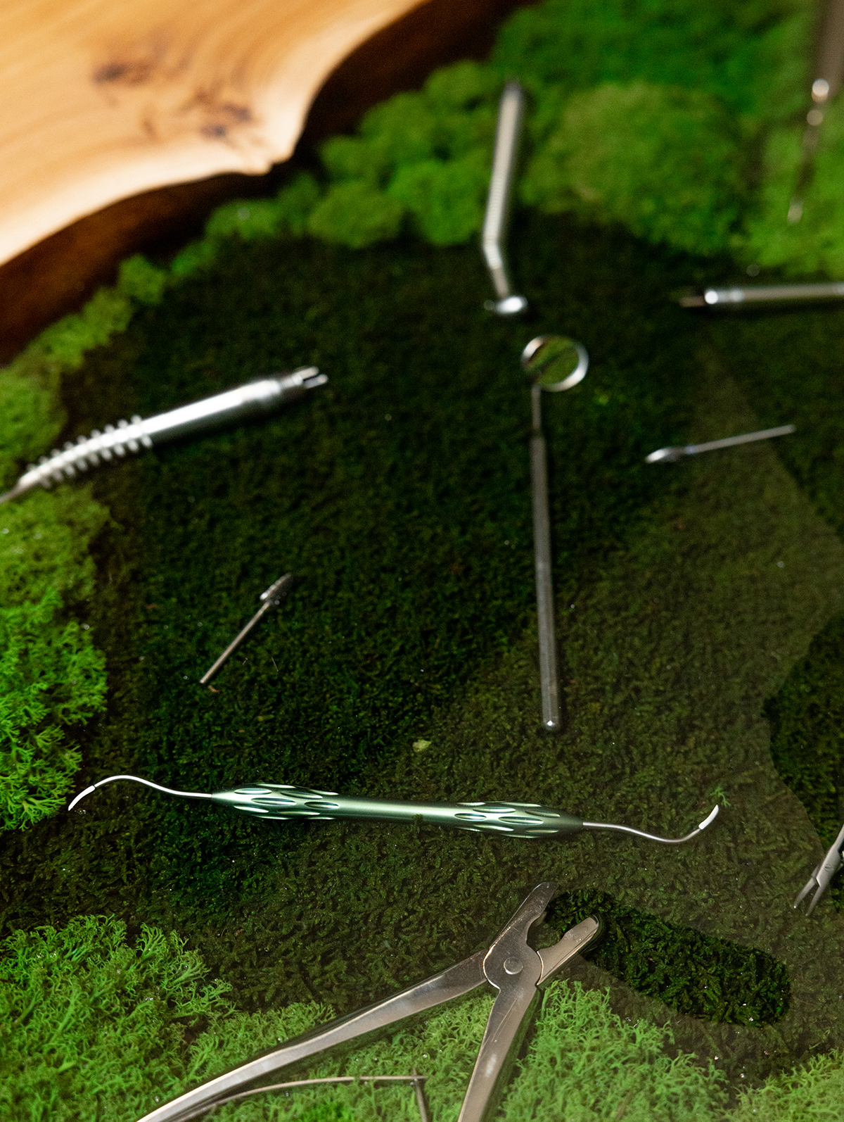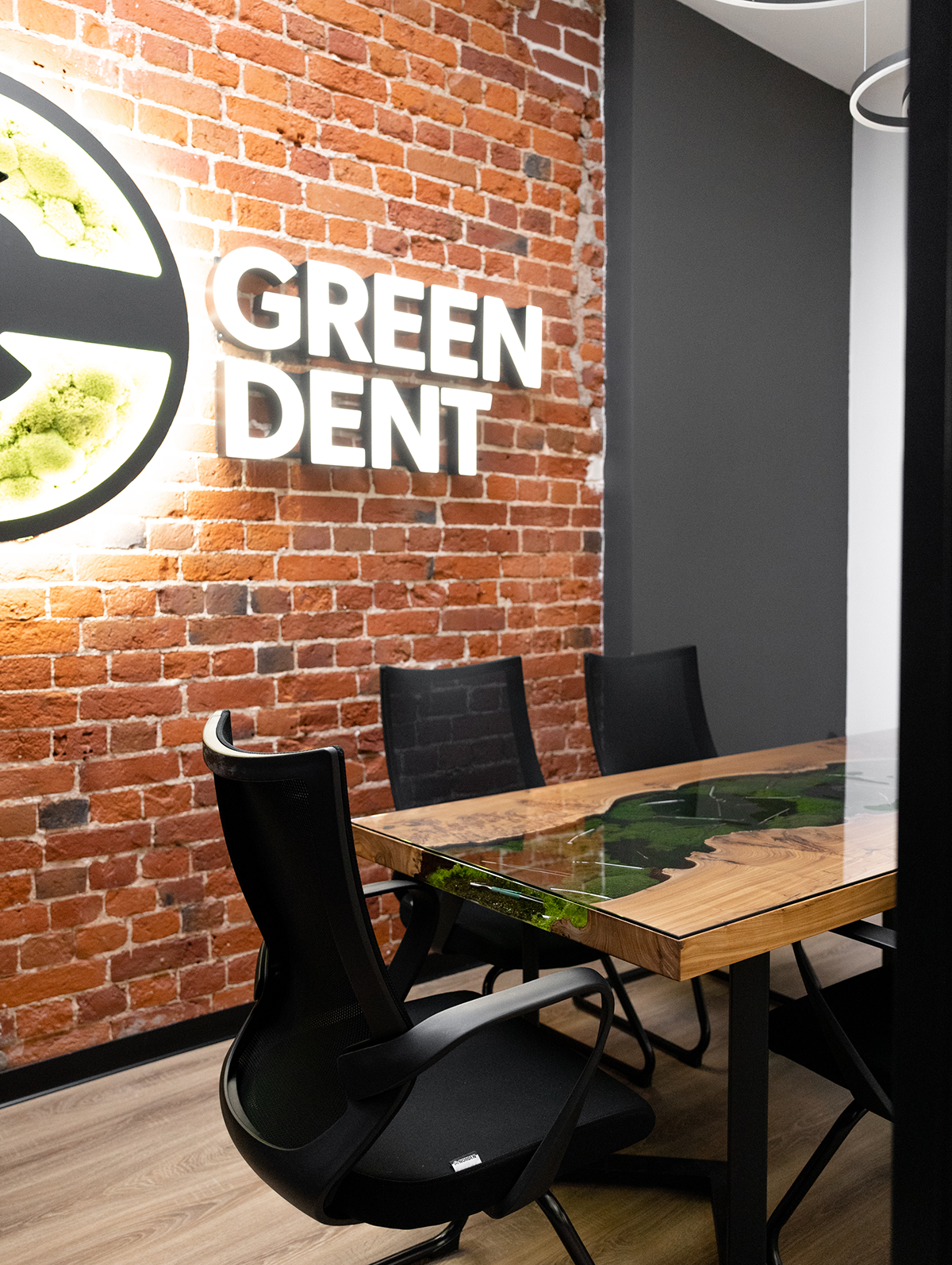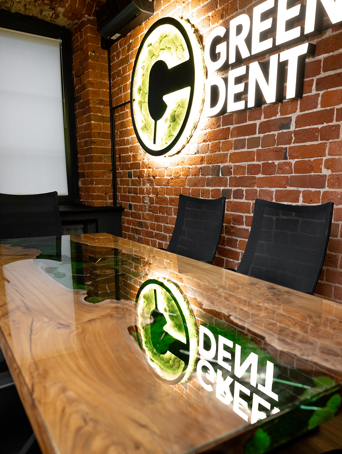 В основе стола – эксклюзивный слэб из горного карагача размером 2000×800 мм. Красивая структура дерева и необычная яркая фактура среза окружают реку из эпоксидной смолы, внутри которой спрятаны стоматологические инструменты и стабилизированный мох. А в центре ослепительным блеском переливается металлическая буква G.